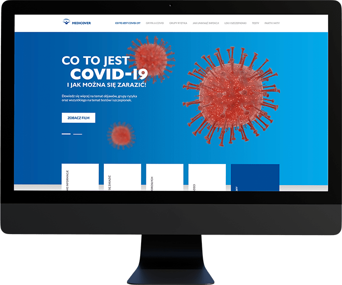 Dla Medicoveru zaprojektowaliśmy rozbudowaną, interaktywną zakładkę o COVID‑19, w której wykorzystaliśmy animacje 3D.